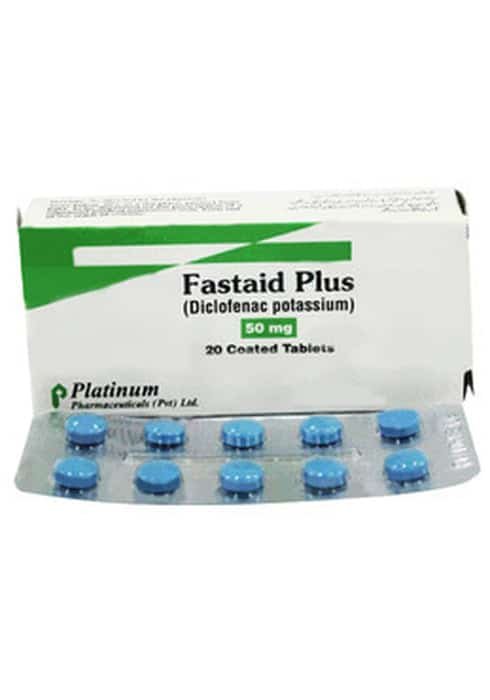 Fastaid Plus 50mg Tablet contains Diclofenac Potassium as its active ingredient. It belongs to a class of medications known as nonsteroidal anti-inflammatory drugs (NSAIDs). Diclofenac Potassium works by reducing inflammation, pain, and fever by inhibiting the production of certain chemicals in the body. Fastaid Plus 50mg Tablet is formulated for oral administration and is used to relieve mild to moderate pain and inflammation associated with various conditions.