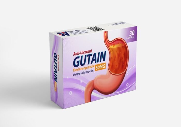 Gutain 60mg Capsule contains Dexlansoprazole as its active ingredient. Dexlansoprazole is a proton pump inhibitor (PPI) medication used to treat conditions related to excessive stomach acid production. It works by reducing the production of stomach acid, thereby alleviating symptoms associated with acid-related disorders such as gastroesophageal reflux disease (GERD) and peptic ulcers.
