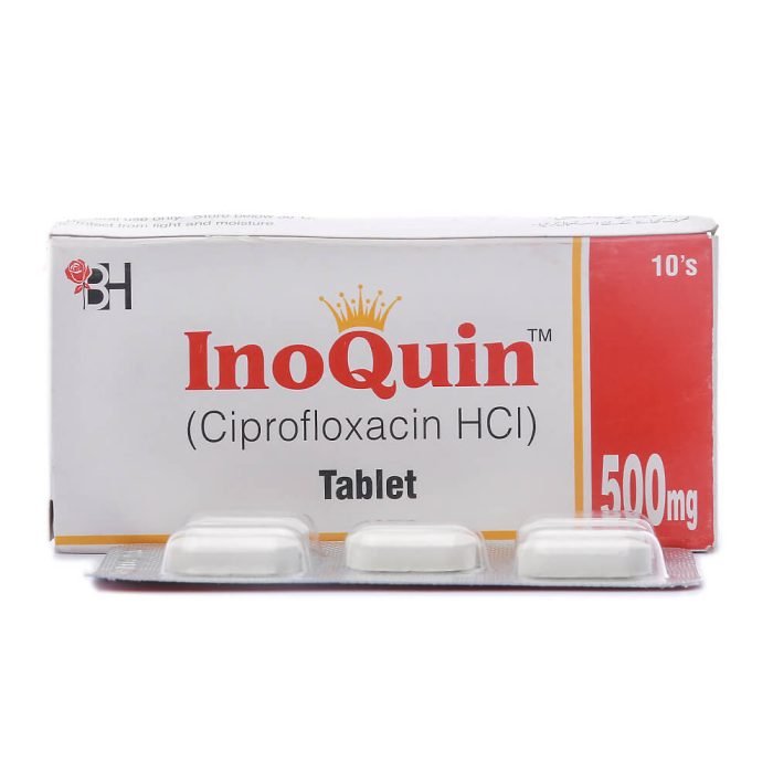 Inoquin 500mg Tablet contains Ciprofloxacin, a broad-spectrum antibiotic in the fluoroquinolone class. It is used to treat various bacterial infections by inhibiting bacterial DNA gyrase and topoisomerase IV, which are essential enzymes for bacterial DNA replication, transcription, repair, and recombination. This makes Ciprofloxacin effective against a wide range of Gram-positive and Gram-negative bacteria.
