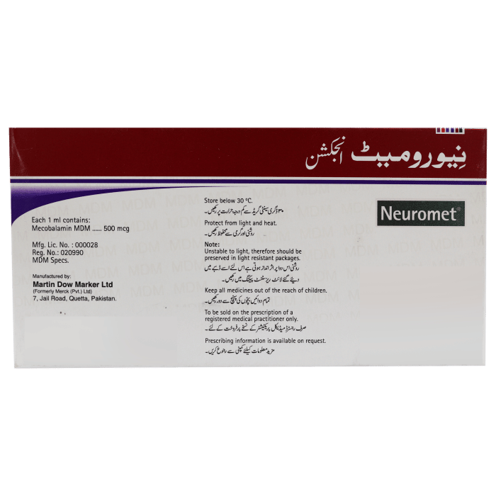 - How often should Neuromet Injection be administered?- The frequency of Neuromet Injection administration depends on the severity of the vitamin B12 deficiency and the patient’s response to treatment. It may be administered daily, weekly, or monthly as determined by the healthcare provider.
