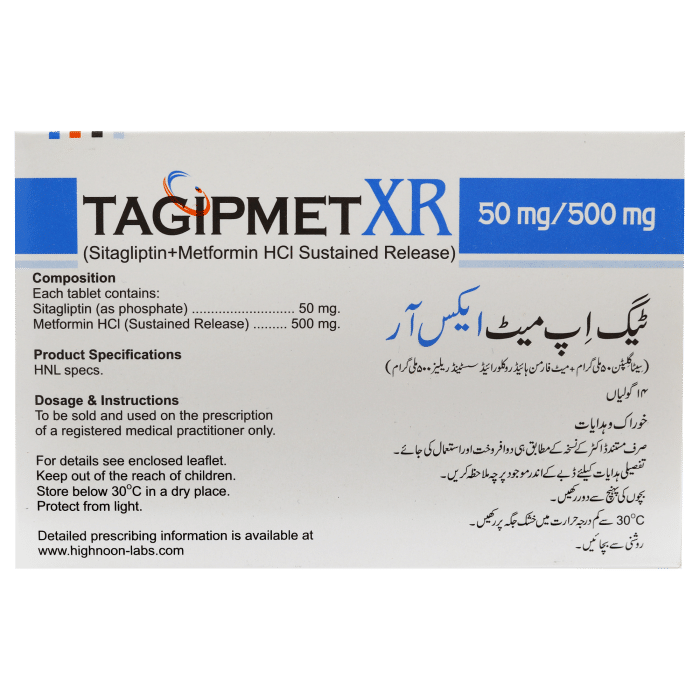 Tagipmet XR 50/500mg Tablet is a combination medication containing two active ingredients: Sitagliptin & Metformin. It is prescribed to manage type 2 diabetes mellitus by helping to control blood sugar levels.