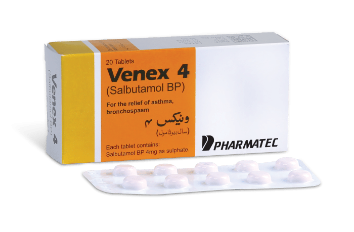 - Asthma: Venex 4mg Tablet is used to relieve symptoms of asthma, such as wheezing, shortness of breath, and chest tightness. It helps to open up the airways and improve breathing.